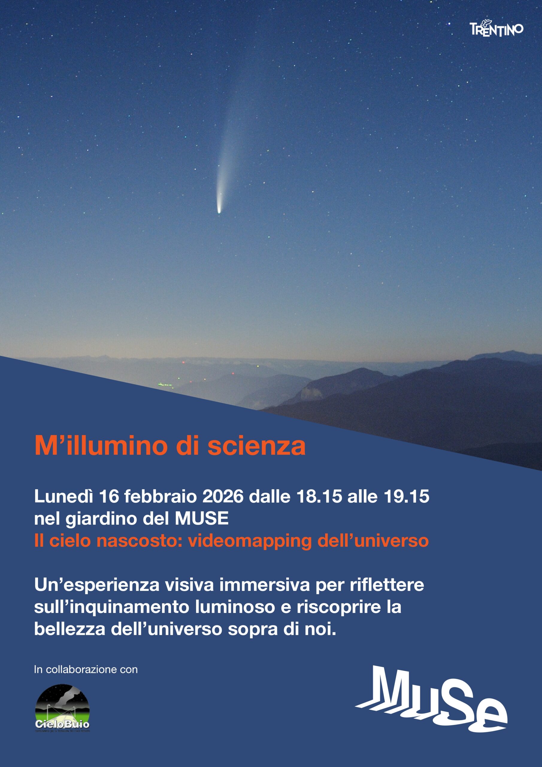 16 febbraio 2026 – “Il cielo nascosto: videomapping dell’universo”: CieloBuio al MUSE di Trento per “M’illumino di meno 2026”