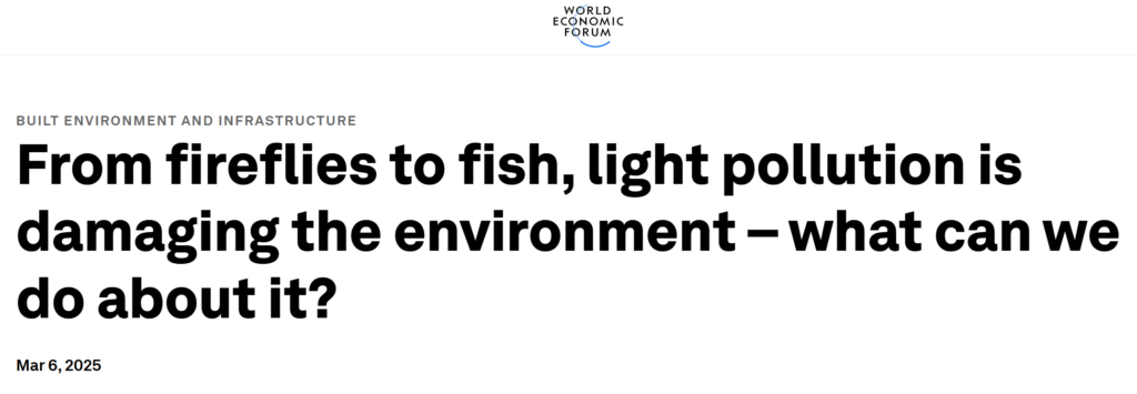 Per approfondire: From fireflies to fish, light pollution is damaging the environment – what can we do about it? – articolo di Emma Charlton, World Economic Forum, 6 marzo 2025 (articolo in lingua inglese)